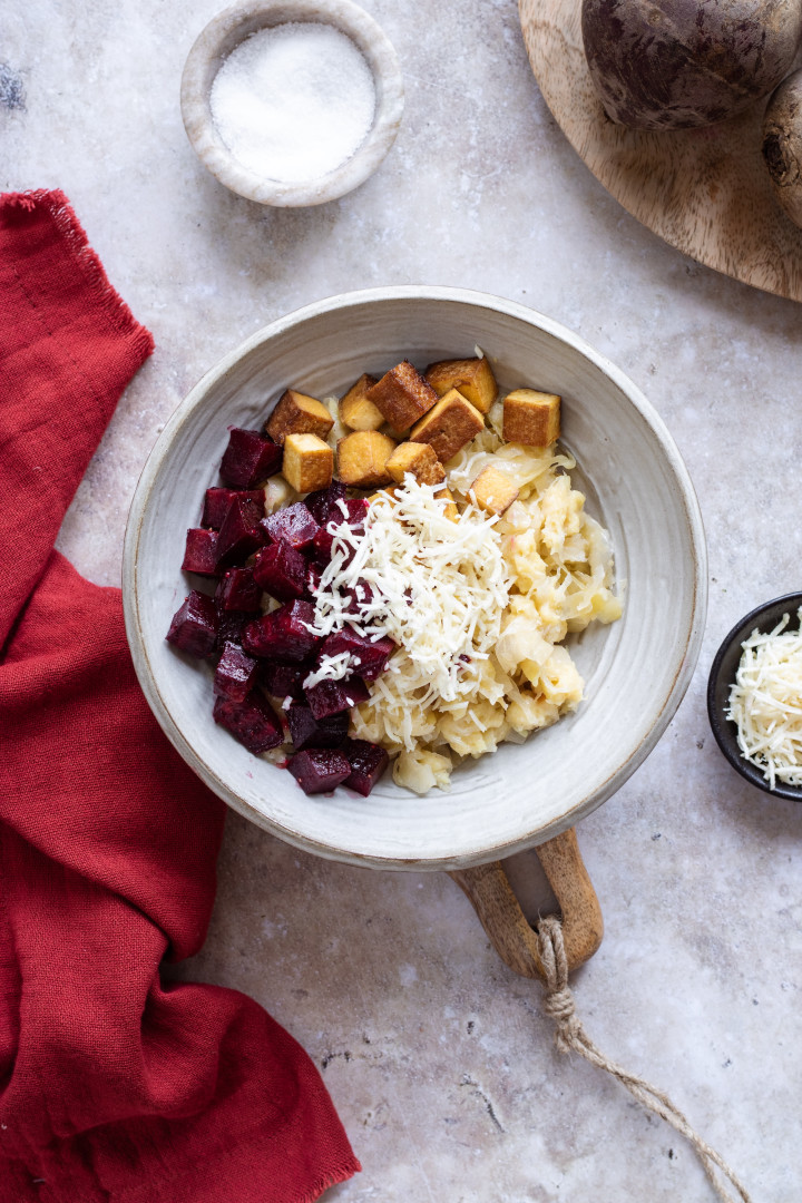 Podávame strapačky s kapustou, pečenou cviklou, tofu a čerstvo nastrúhaným chrenom.