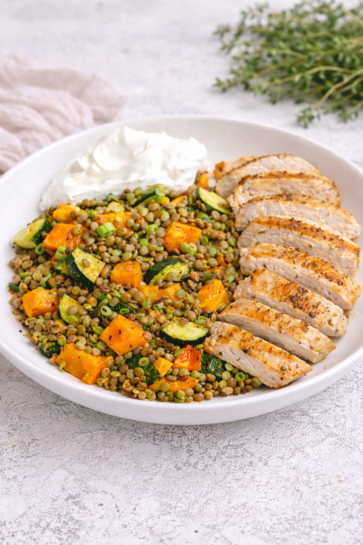 Jemne opečená tekvica hokkaido, cuketa a šošovica vytvárajú skvelý základ, ktorý dopĺňajú šťavnaté kuracie pásiky a krémový jogurtový kopček. Jedlo, ktoré zahreje, zasýti a poteší chuťové poháriky.