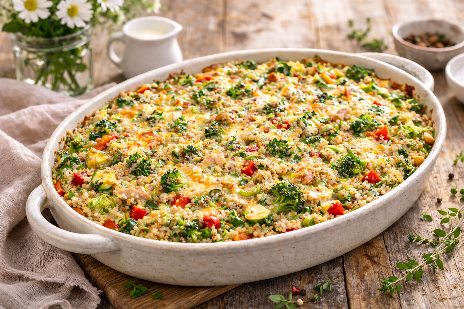 Ak hľadáš jednoduché, rýchle a pritom výživné jedlo, táto zapekaná quinoa s brokolicou a tuniakom je skvelou voľbou. Kombinácia jemnej quinoy, chrumkavej brokolice a šťavnatého tuniaka vytvorí dokonale vyvážený pokrm, ktorý chutí skvele teplý aj na druhý deň.